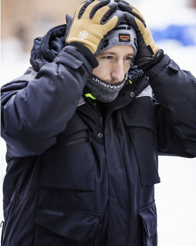 Vind- og vanntett parkas med pustende egenskaper og tapede sømmer. Vattert polstret fôr. Høy krage med avtakbar hette. Sidelommer med klaff. To store brystlommer med klaff. Hellang glidelås helt opp til kragen, beskyttet av knepping med skjulte trykknapper. Refleksdetaljer for bedre synlighet. Mansjetter med borrelås. Zip med enhåndsgrep i siden. Glidelås på innsiden for logomerking.