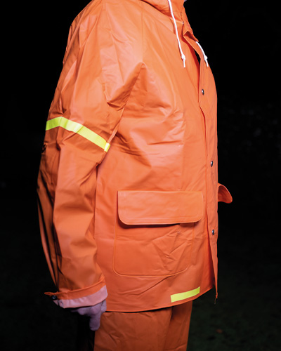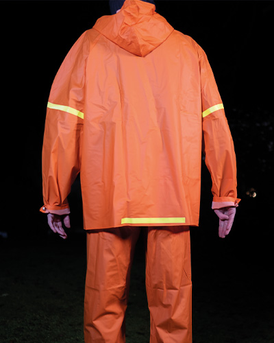 Praktisk regnsett med reflex, jakke med hette og bukse med bukseseler.